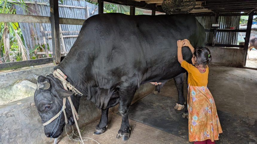 পটুয়াখালীর মির্জাগঞ্জ উপজেলার উত্তর ঝাটিবুনিয়া গ্রামের বাসিন্দা সোহাগ মৃধার ষাঁড়টির নাম ‘কালো মানিক’। লম্বায় ১০ ফুট, উচ্চতায় ৫ ফুট ৪ ইঞ্চি আর ওজন প্রায় ১ হাজার ৪০০ কেজি। কুচকুচে কালো রঙের ফ্রিজিয়ান জাতের ষাঁড়টি এখন তাঁর পরিবারের সদস্যের মতোই। গ্রামের মানুষও ষাঁড়টিকে ‘কালো মানিক’ বলেই চেনেন।